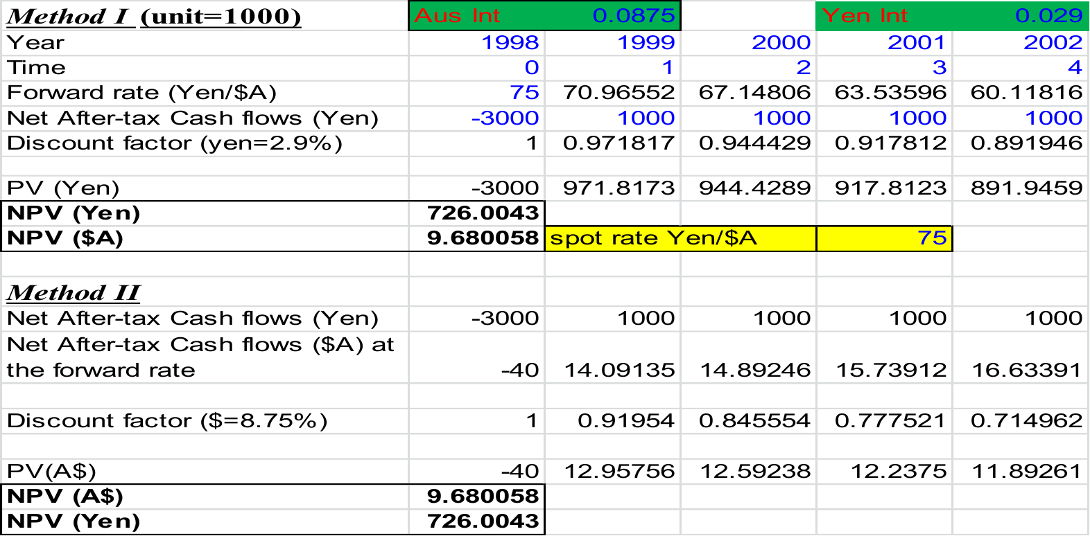 Polaris (Aus), is considering building a plant in Japan its major export market. The plan would cost Yen 3m to build and will produce cash flows of Yen 1m each year for the next 4 years. The investment is risk-free. Other information is: