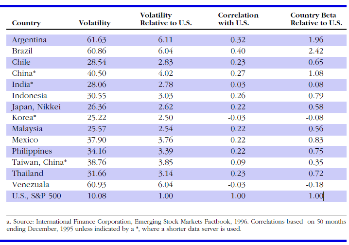- Country with high volatility relative to the U.S can have low betas because of the low correlation of the country's equity performance with the U.S equity market