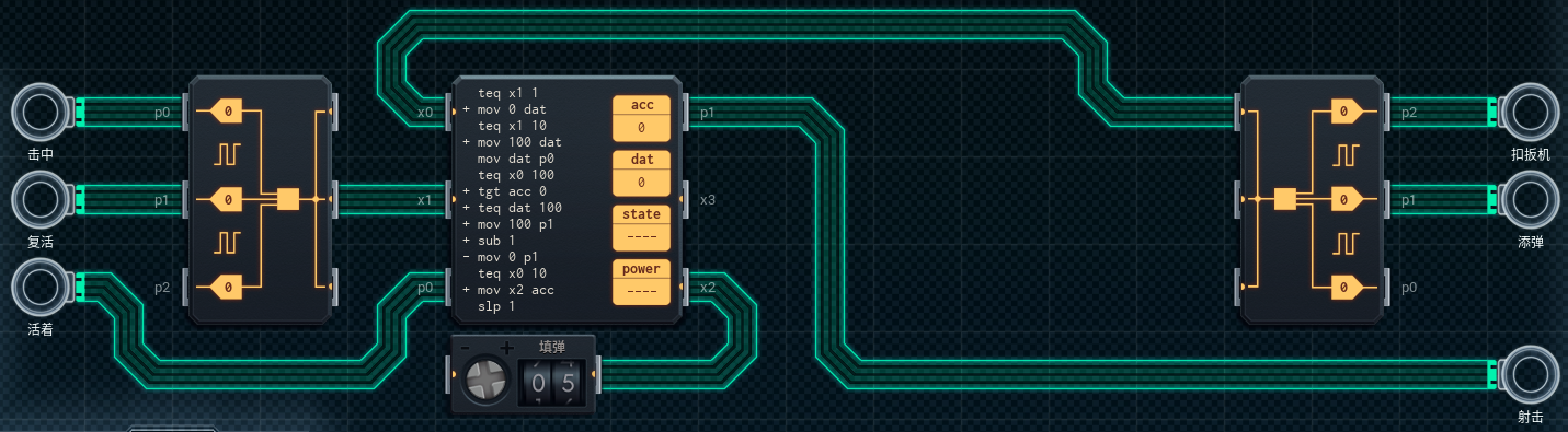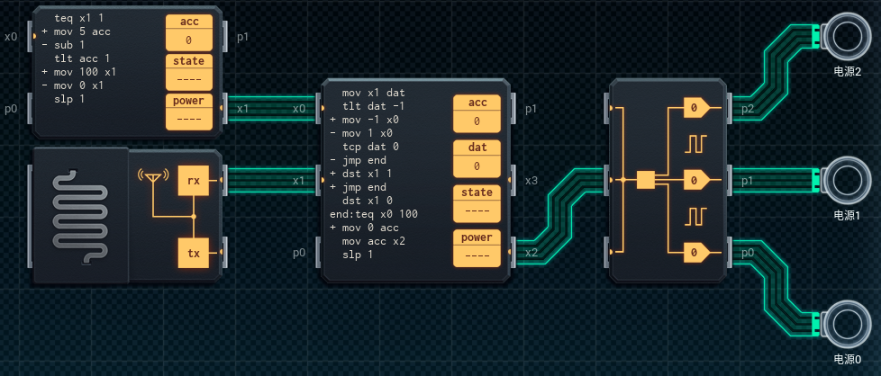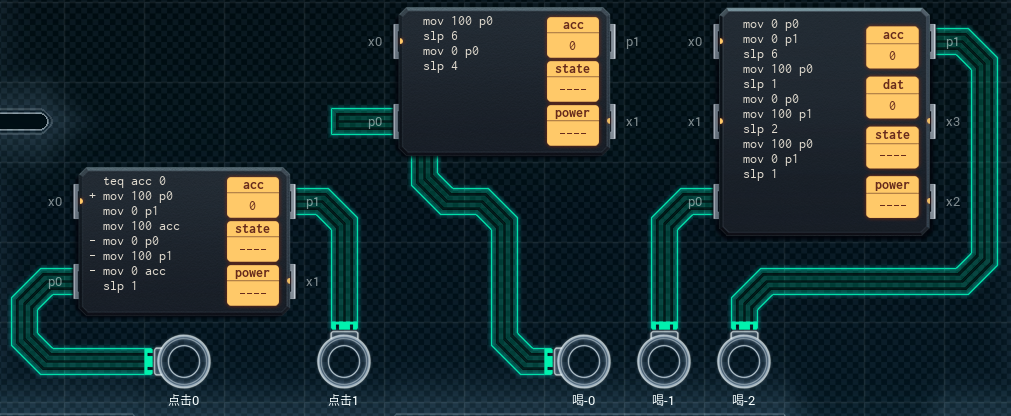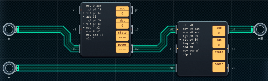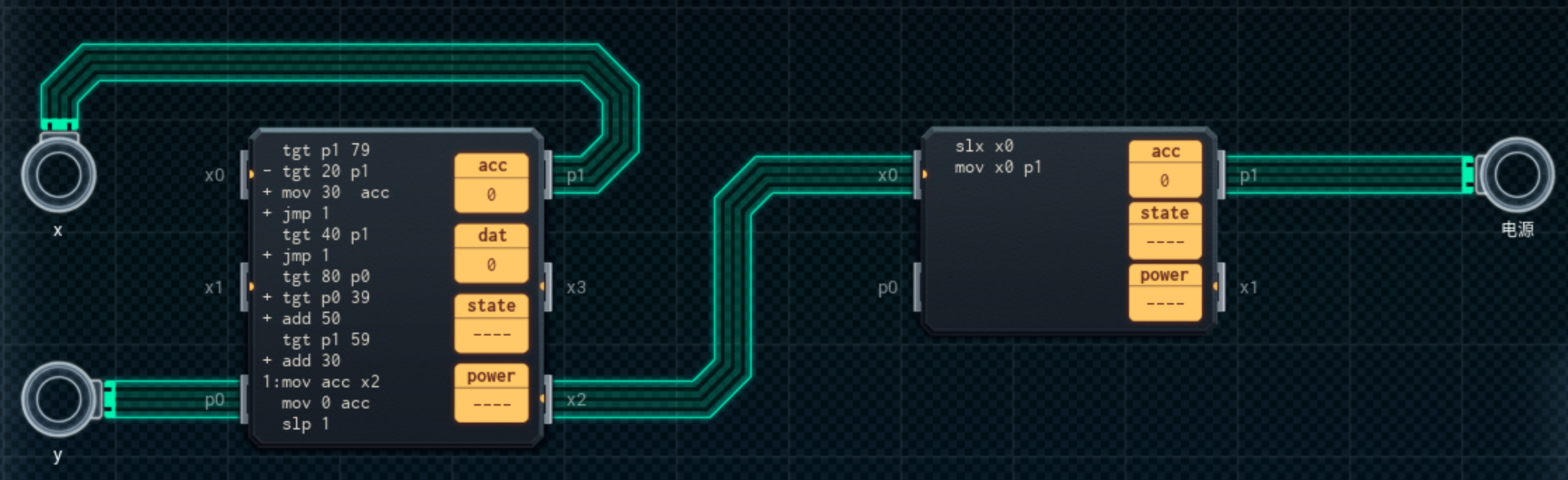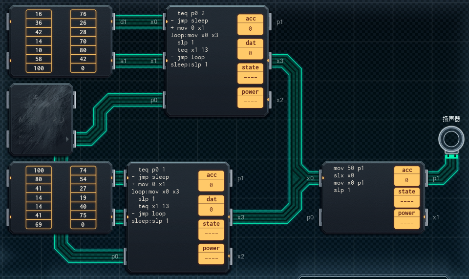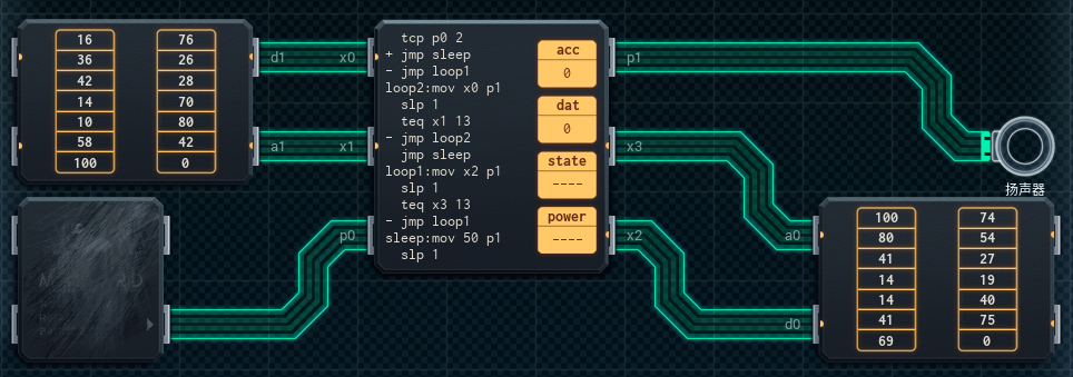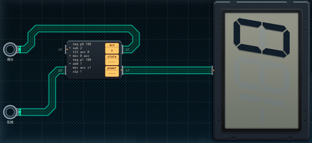 这关需要提供三个p引脚输出,很明显要用到DX300。DX300接收的是一个三位数,这里就要利用dst指令来给指定数位赋值。然而dst指令是只能作用于acc的,这关还额外要求我们设计一个倒计时功能。注意dat是无法进行运算操作的,只是一个储存器,因此很明显我们需要两个acc。