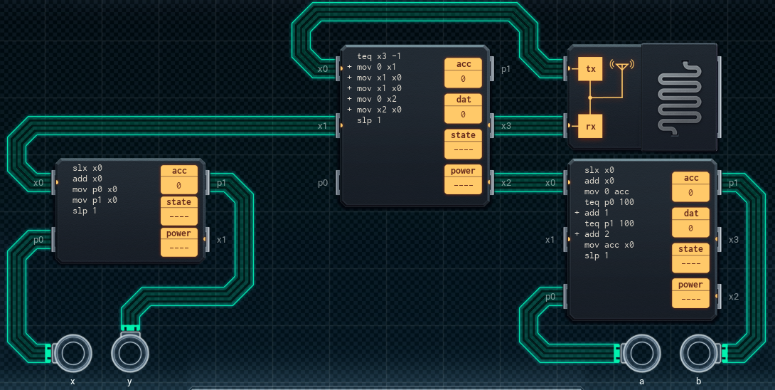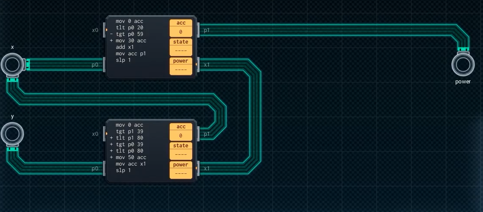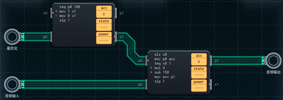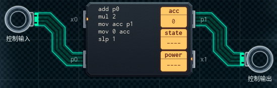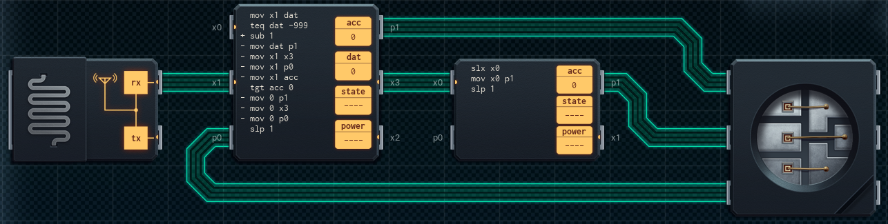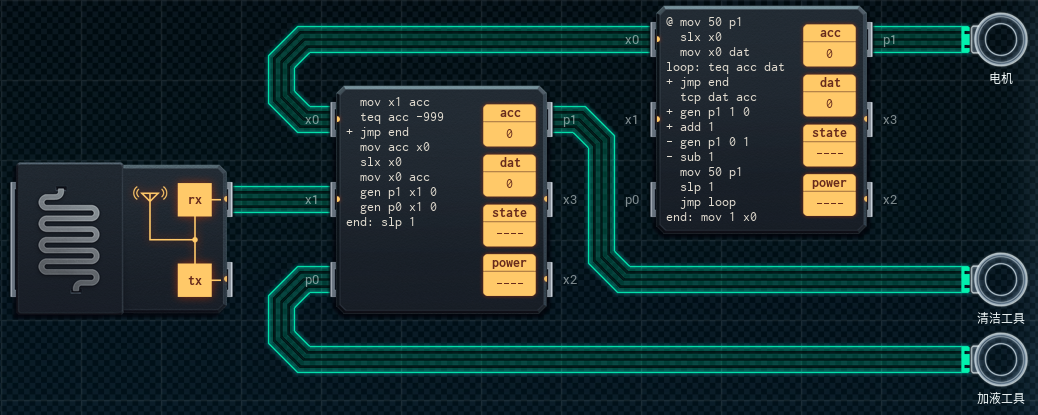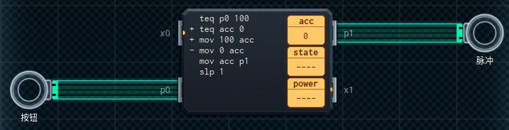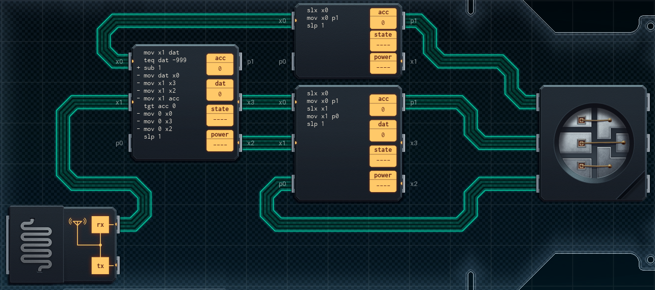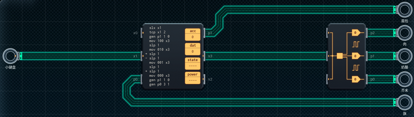 这关需要提供三个p引脚输出,很明显要用到DX300。DX300接收的是一个三位数,这里就要利用dst指令来给指定数位赋值。然而dst指令是只能作用于acc的,这关还额外要求我们设计一个倒计时功能。注意dat是无法进行运算操作的,只是一个储存器,因此很明显我们需要两个acc。