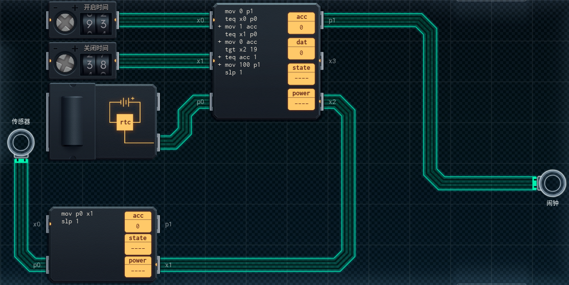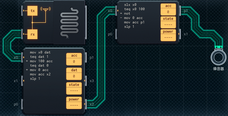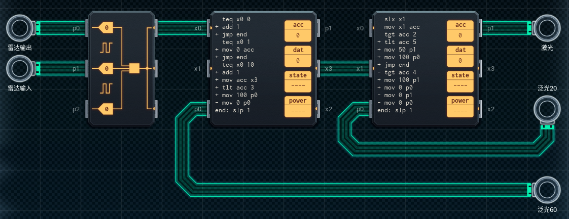 这关只要善用jmp,写出来还是挺容易的。收到“雷达输出”的时候开始用acc计时,收到“雷达输入”的时候停止计时(并且别忘了acc + 1)。然后就判断acc的范围,一个控制器写不下就通过xBus接口转发。