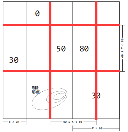 所以我当时咋就没看出来呢。。。有了这个信息,那就简单很多了。首先通过x的区间,决定是0或30。然后再通过x和y共同决定是否+50(也就是0或50),最后把两个数值加一起就行了。
