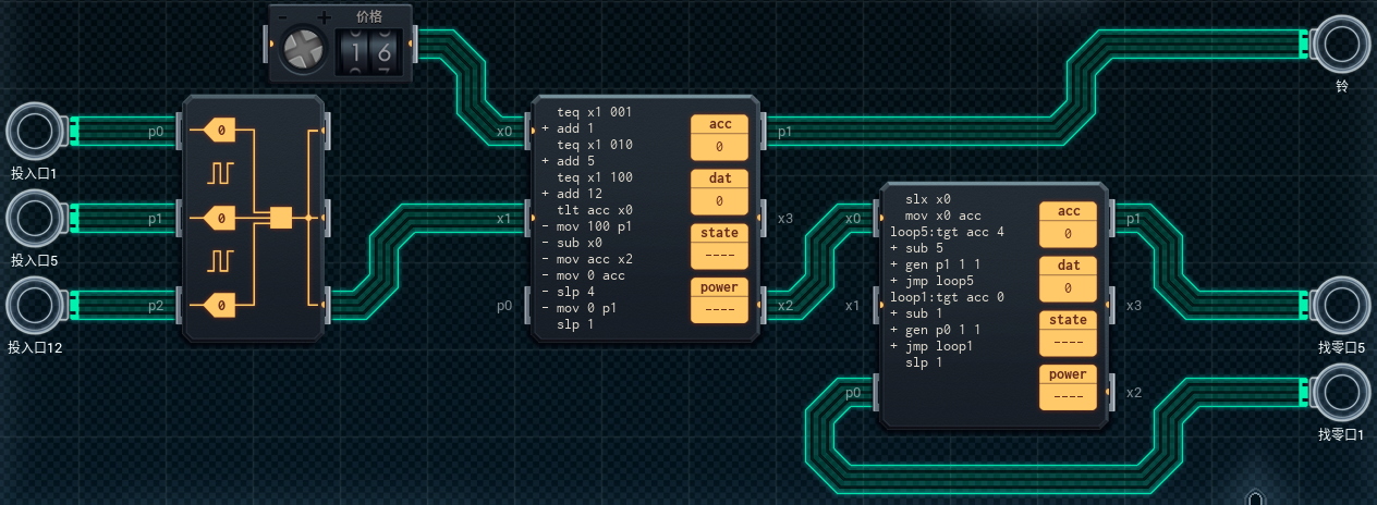 这关出乎意料的简单,一次就写出答案了。这里用了两块控制器,一块收钱响铃,另一块找钱。