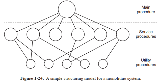 - 整个操作系统在内核态以单一程序的方式运行