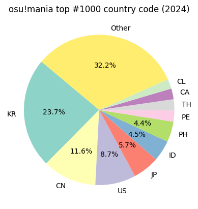 1 2 3 4 5 6 7 8 9 10 11 12 13 14 15 16 17 18 19 20 21 22 23 24 25 26 27 28 29 30 31 32 33 def shift_row_to_bottom (df, index_to_shift ): """Shift row, given by index_to_shift, to bottom of df.""" idx = df.index.tolist() idx.pop(index_to_shift) df = df.reindex(idx + [index_to_shift]) return df def my_autopct (pct ): return ('%1.1f%%' % pct) if pct > 4 else '' df_draw.loc[df_draw['count' ] < 20 , 'country_code' ] = 'Other' df_draw = df_draw.groupby('country_code' )['count' ].sum ().reset_index() df_draw = df_draw.sort_values('count' , ascending=False , ignore_index=True ) df_draw = shift_row_to_bottom(df_draw, 1 ) cm = plt.get_cmap('Set3' ) matplotlib.rcParams["axes.prop_cycle" ] = cycler( color=[cm(v) for v in np.linspace(0 , 1 , len (df_draw))] ) plt.pie(df_draw['count' ], labels=df_draw['country_code' ], autopct=my_autopct, startangle=140 ) plt.title("osu!mania top #1000 country code (2024)" ) plt.show()