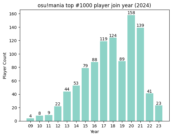 前排提醒:本文仅仅抓取了排行榜前 1000 的玩家,不在排行榜内的退役玩家是抓取不到的。而且本文使用的区分 4k 和 7k 玩家的方法相当粗糙,极有可能不准确。分析结果仅供参考,图一乐就行。