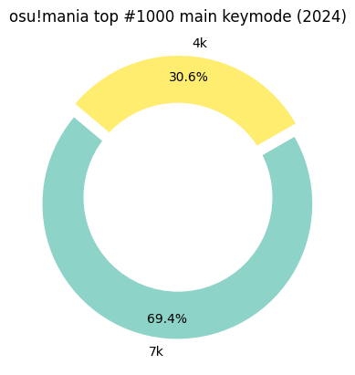 1 2 3 4 5 6 7 8 9 10 11 12 13 14 15 16 17 18 19 20 21 df_draw = df_draw.groupby('main_keymode' )['count' ].sum ().reset_index() df_draw = df_draw.sort_values('count' , ascending=False , ignore_index=True ) cm = plt.get_cmap('Set3' ) matplotlib.rcParams["axes.prop_cycle" ] = cycler( color=[cm(v) for v in np.linspace(0 , 1 , len (df_draw))] ) explode = [0.05 , 0.05 ] plt.pie(df_draw['count' ], labels=df_draw['main_keymode' ], autopct='%1.1f%%' , startangle=140 , explode=explode, pctdistance=0.85 ) plt.title("osu!mania top #1000 main keymode (2024)" ) centre_circle = plt.Circle((0 , 0 ), 0.70 , fc='white' ) fig = plt.gcf() fig.gca().add_artist(centre_circle) plt.show()