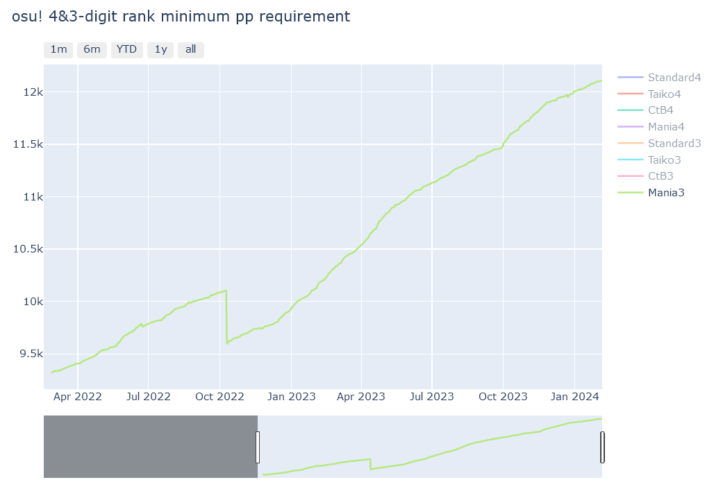 从我另一个项目 oscarcx123/osu-minimum-pp 可以看到三位数门槛走势图