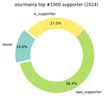 1 2 3 4 5 6 7 8 9 10 11 12 13 14 15 16 17 18 19 df_draw = df.groupby(['has_supported' , 'is_supporter' ]).size().to_frame(name='count' ) status = ['never' , 'was_supporter' , 'is_supporter' ] df_draw['status' ] = status cm = plt.get_cmap('Set3' ) matplotlib.rcParams["axes.prop_cycle" ] = cycler( color=[cm(v) for v in np.linspace(0 , 1 , len (df_draw))] ) explode = [0.1 , 0 , 0 ] plt.pie(df_draw['count' ], labels=df_draw['status' ], autopct='%1.1f%%' , startangle=140 , explode=explode, pctdistance=0.85 ) plt.title("osu!mania top #1000 supporter (2024)" ) centre_circle = plt.Circle((0 , 0 ), 0.70 , fc='white' ) fig = plt.gcf() fig.gca().add_artist(centre_circle) plt.show()