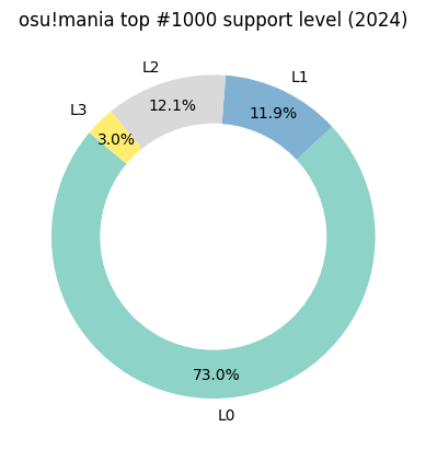 1 2 3 4 5 6 7 8 9 10 11 12 13 14 15 16 17 18 19 20 21 df_draw = df.groupby('support_level' ).size().to_frame(name='count' ) df_draw = df_draw.sort_values('support_level' , ascending=True ).reset_index() df_draw['support_level' ] = 'L' + df_draw['support_level' ].astype(str ) df_draw cm = plt.get_cmap('Set3' ) matplotlib.rcParams["axes.prop_cycle" ] = cycler( color=[cm(v) for v in np.linspace(0 , 1 , len (df_draw))] ) plt.pie(df_draw['count' ], labels=df_draw['support_level' ], autopct='%1.1f%%' , startangle=140 , pctdistance=0.85 ) plt.title("osu!mania top #1000 support level (2024)" ) centre_circle = plt.Circle((0 , 0 ), 0.70 , fc='white' ) fig = plt.gcf() fig.gca().add_artist(centre_circle) plt.show()