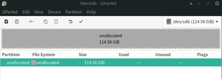 这里使用GParted,毕竟图形界面还是非常直观的。如果非要用命令行分区,那fdisk、gdisk、cfdisk、parted也都可以胜任。这四个里头,个人感觉cfdisk应该是最容易上手的,因为它是图形化的命令行工具。