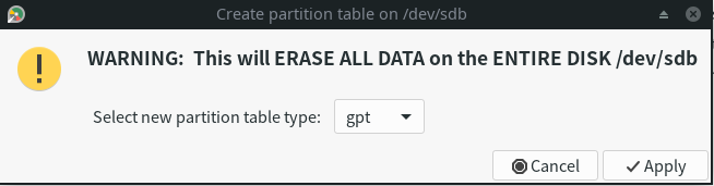 然后通过 Device > Create Partition Table 来建立GPT分区表,这里选中gpt然后点Apply,如下所示