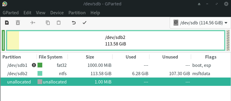 分区之后会发现,此时还有1MB空间未分配,这个是GParted自动预留的,如下所示。