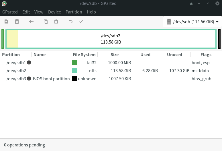 然而GParted貌似无法给最后那个分区标记bios_grub,所以就用其它工具来完成。