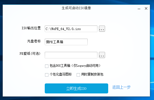 打开安装器之后,点击右下角的光盘图标,然后点击“立即生成ISO”,如下所示。